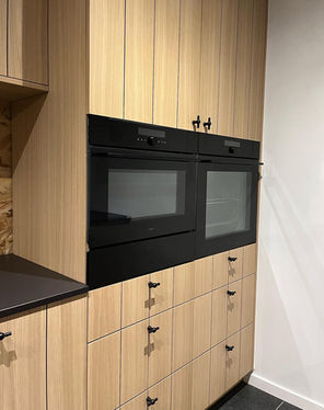 Volledige keuken in paruma oak, afgwerkt met dekton sasea.